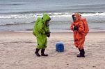 Ćwiczenia strażaków związane z zagrożeniem chemicznym na usteckiej plaży