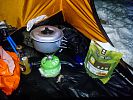 Noc nie rozpieściła. Temperatura spadła do -15 i znów wszystko zamarznięte. Całe szczęście zapobiegawczo włożyłem do śpiwora kurtkę, rękawice, buty i skarpety, więc mogłem rano wszystko bez problemów założyć. Co prawda z takim "majdanem" nie śpi się najwygodniej, ale to i tak lepsze niż wciskanie nogi do lodowej skorupy buta.